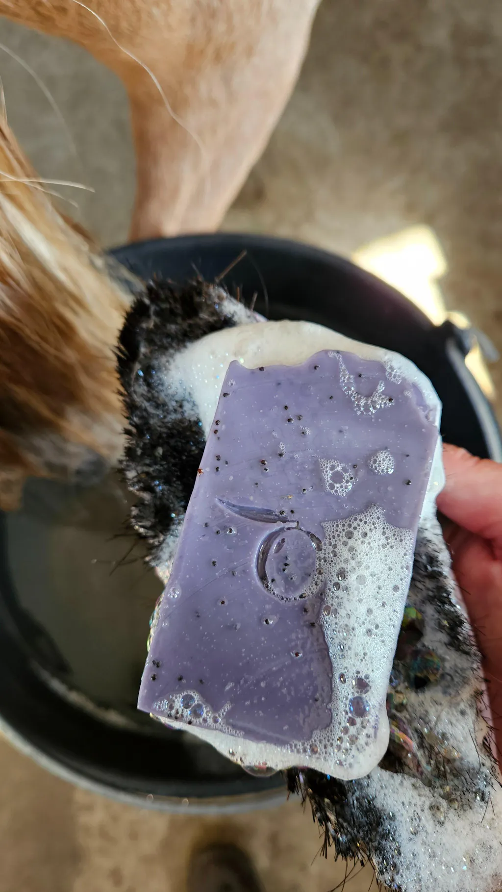 1. Thoroughly wet your dog’s or horse’s coat and the shampoo bar.